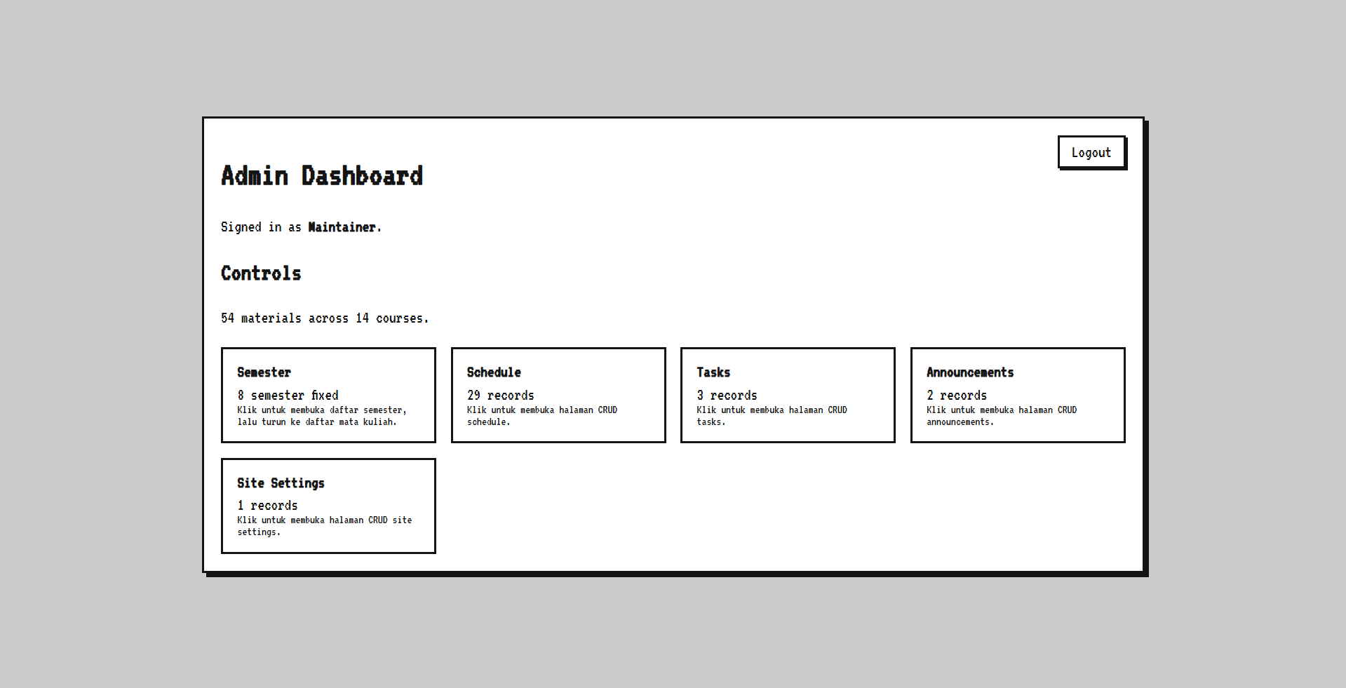 Project ini dibangun dengan React + Vite di sisi frontend dan PocketBase sebagai backend data. Selain halaman publik untuk browsing materi per semester dan mata kuliah, saya juga membuat admin dashboard kustom untuk mengelola materi, pengumuman, task, jadwal, dan site settings langsung dari web tanpa bergantung ke panel bawaan PocketBase.